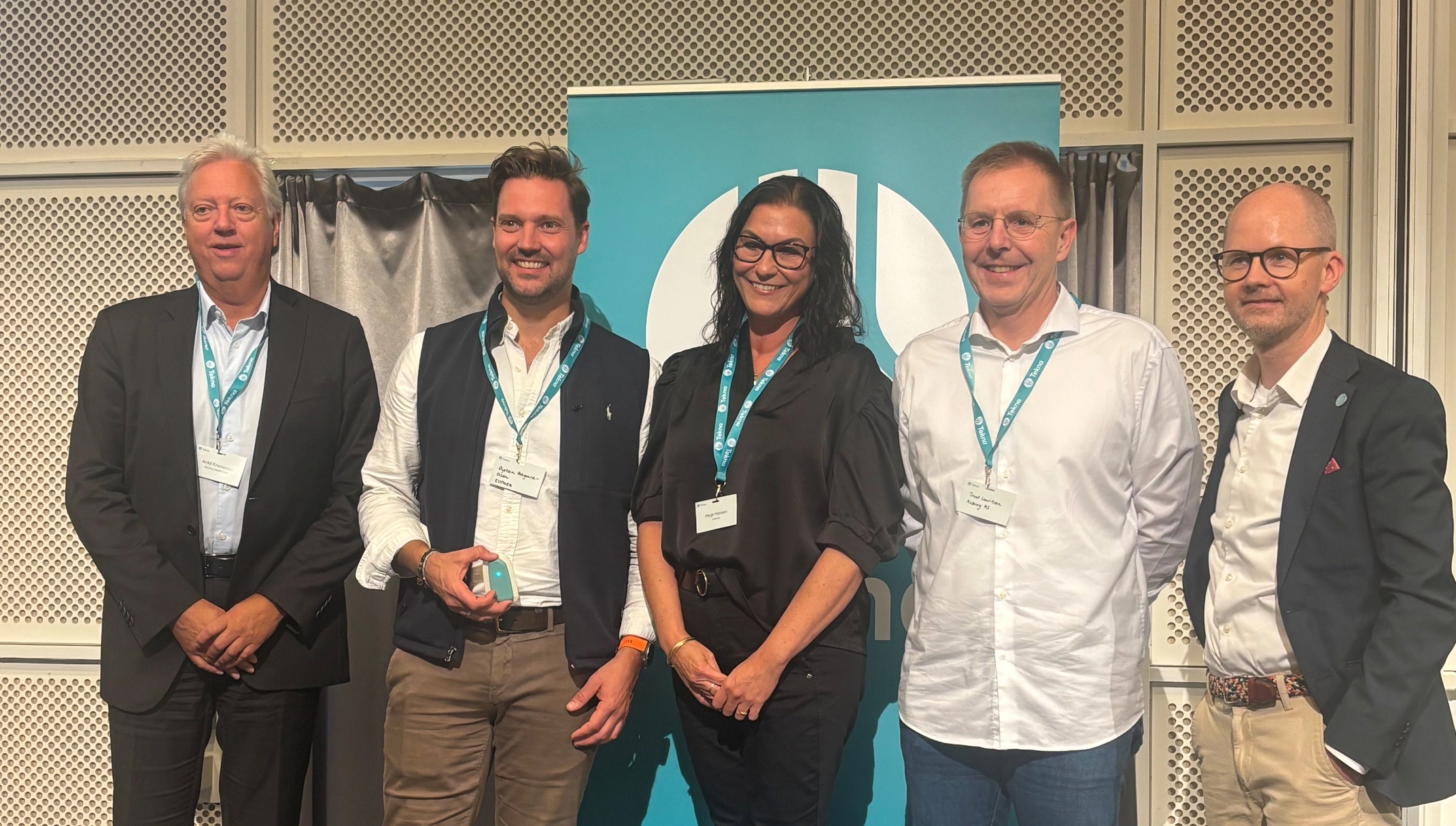 Finalister og prisutdelere, fra v.: Arild Kristense (COO Norway Health Tech), Øystein Ødegaard-Olsen (CEO Eupnea), Hege Hansen (CEO Induvita), Trond Lauritzen (CEO Aidency), Krister Nyløkken (Visepresident Tekna)